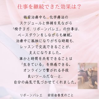 治療中に家にこもり孤独になりがちな時期も、レッスンで参加者と語り交流できることが、支えになりました。